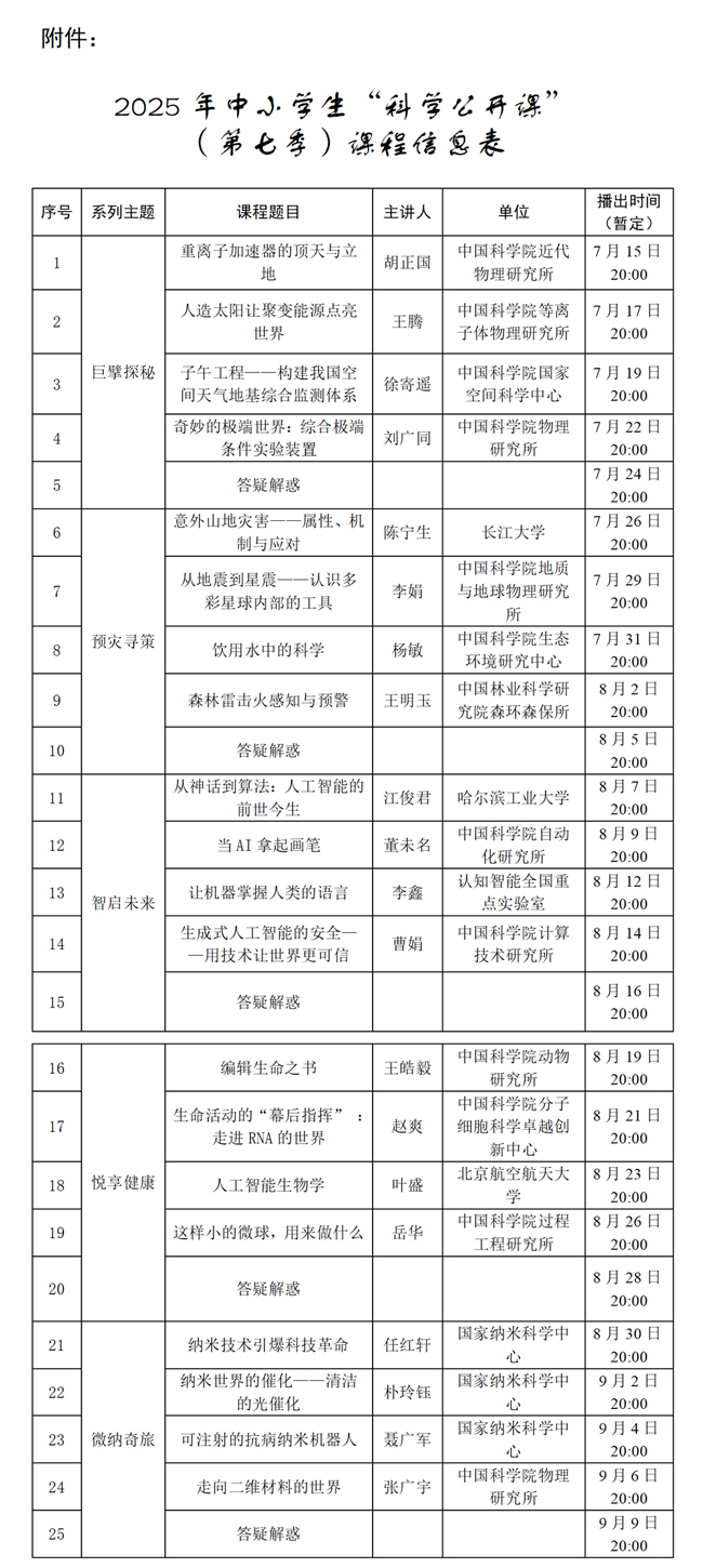 2025年中小學(xué)生“科學(xué)公開(kāi)課”(第七季)課程信息表