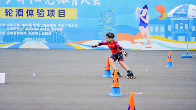在一眾風(fēng)馳電掣的追風(fēng)少年隊(duì)伍里,有一道身影格外引人注意。來自甘肅省代表隊(duì)的蘇玥小心翼翼地控制著腳下的輪滑鞋,還在障礙設(shè)置密集的區(qū)域一度停滯不前。現(xiàn)場觀眾們感受到了她的不安,此起彼伏地為她加油打氣。最終,蘇玥順利越過了所有障礙,成功抵達(dá)了終點(diǎn),也迎來全場熱烈的掌聲。蘇玥帶著釋然放松的笑,慢悠悠地滑到了場邊。“今天發(fā)揮得還不錯,沒摔跤!”蘇玥是本次甘肅省代表隊(duì)參加籃球項(xiàng)目的運(yùn)動員,對于輪滑項(xiàng)目,她坦言,“確實(shí)是抱著體驗(yàn)的心態(tài)來的。因?yàn)閯偩気喕瑳]多久,所以這次給自己設(shè)定的目標(biāo)就是順利抵達(dá)終點(diǎn)就好?!蓖ㄟ^這次體驗(yàn),蘇玥對輪滑也有了更深入的了解?!拜喕v究協(xié)調(diào)性,在協(xié)調(diào)的基礎(chǔ)上還得有速度。”她一邊說著還一邊展示著自己新學(xué)的技巧,“輪滑挺有意思的,下次還玩!”