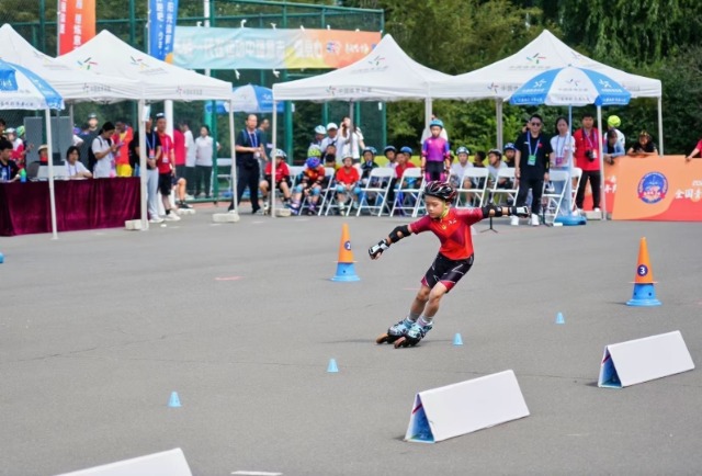 比賽現(xiàn)場,小小運(yùn)動員們時而雙輪并行,時而單輪繞樁,雙腳如疾走的鐘擺,在極小的空間內(nèi)高頻交叉、點(diǎn)踏、畫圈,輪子敲擊地面的脆響形成獨(dú)特的節(jié)拍,腳下的輪子化作一個個高速運(yùn)轉(zhuǎn)的銀點(diǎn),每一個少年都仿佛一道勁風(fēng),以嫻熟的專業(yè)技術(shù)和勇于拼搏的運(yùn)動精神將現(xiàn)場觀眾的熱情徹底點(diǎn)燃。