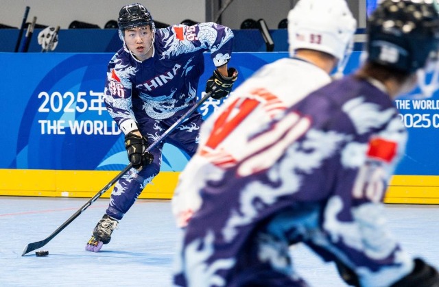 8月7日,中國隊選手胡文瀚(左一)在成都世運會單排輪滑球男子A組預(yù)賽中。新華社記者 謝劍飛 攝