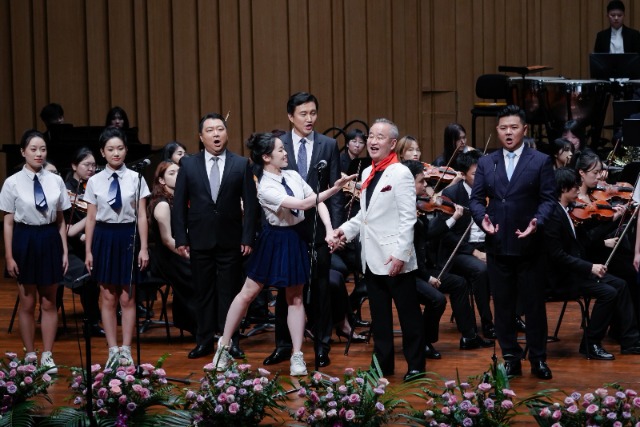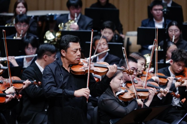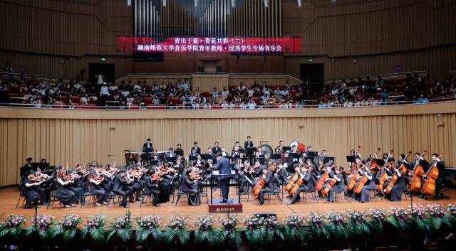 本場音樂會主題中,“青”代表在教師指引下嶄露頭角的優(yōu)秀學子,他們在課堂汲取知識養(yǎng)分,在實踐中錘煉專業(yè)技藝;“藍”象征深耕教壇、潛心育人的教師群體,他們以扎實的專業(yè)積淀為學子引路,以滿腔育人熱忱為成長護航。音樂會在瀟湘愛樂交響樂團充滿濃郁湖南味道的管弦樂《花鼓抒懷》中拉開帷幕。其中,廖勇創(chuàng)作的電影音樂組曲《影·響》展現(xiàn)了中西影視音樂創(chuàng)作的碰撞融合。著名小提琴演奏家、學院教授柴亮執(zhí)弓演繹學院名譽院長趙季平的《第一小提琴協(xié)奏曲》,以細膩琴音詮釋大師作品的深厚內涵。青年教師錢樹林深情演繹《美麗時光》,充滿新疆音樂風格的表演讓人耳目一新。青年教師夏攀與博士生導師陳果教授合作的二胡協(xié)奏曲《紅梅隨想曲》,讓民族樂器的悠揚與大提琴的渾厚相得益彰。青年教師瞿鈺潔、謝韻蕾帶來的《花之二重唱》,盡顯西方歌劇的優(yōu)雅浪漫。壓軸曲目《長大后我就成了你》由虢建武、于洋、譚聞達、謝志懷等老中青三代教師與車心怡、何薇羽等學生共同演繹,讓全場情感共鳴達到頂點。