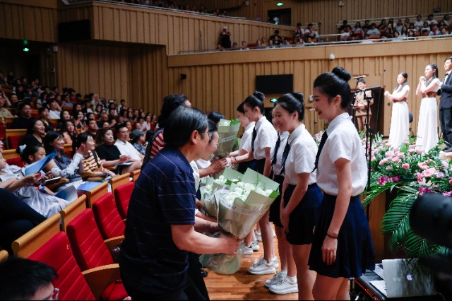 伴隨著天籟合唱團《感恩的心》的輕聲合唱,一場別致的致敬教師儀式溫情上演。作為特邀嘉賓出席的教師代表一一亮相,他們包括湖南省優(yōu)秀教師、湖南省最美教師、湖南省基礎教育名師名校長工作室負責人、湖南師大退休教師和師德標兵等。伴隨著動人的歌聲,青年學子向教師代表們獻上鮮花,全場觀眾也齊聲向老師們道一聲“老師好”,熱烈的掌聲在音樂廳內久久回蕩,向長期扎根三尺講臺、默默奉獻的老師們致以最誠摯的祝福。