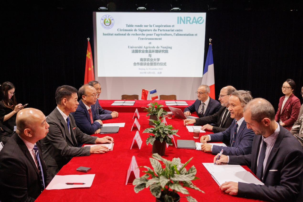 中國教育報-中國教育新聞網(wǎng)訊(通訊員 王璐 記者 郭馨澤)10月10日,法國國家農(nóng)業(yè)食品與環(huán)境研究院(INRAE)與南京農(nóng)業(yè)大學(xué)(NAU)中法植物表型國際聯(lián)合實(shí)驗(yàn)室簽約儀式在北京法國文化中心舉行,此舉標(biāo)志著中法植物表型國際聯(lián)合實(shí)驗(yàn)室正式升級為國家級科研合作平臺。INRAE院長Philippe Mauguin、法國大使館農(nóng)業(yè)參贊Jo Cadilhon、南京農(nóng)業(yè)大學(xué)黨委書記王春春等中外嘉賓參加活動,共同見證這一農(nóng)業(yè)科技領(lǐng)域的重要里程碑。