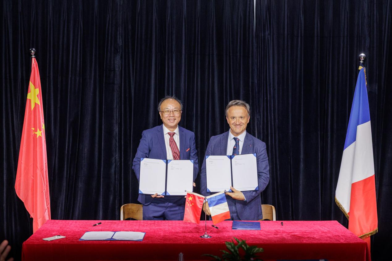 PhilippeMauguin與丁艷鋒共同簽署中法植物表型國際聯(lián)合實(shí)驗(yàn)室協(xié)議。南京農(nóng)業(yè)大學(xué)供圖