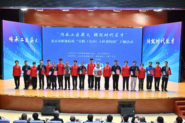 11月4日,北京市職業(yè)院?!皠谀#ù髧┕そ尺M校園”活動中,10名北京科技職業(yè)大學(xué)的學(xué)生為10位勞模工匠頒發(fā)“班級工匠導(dǎo)師”聘書。北京科技職業(yè)大學(xué)供圖