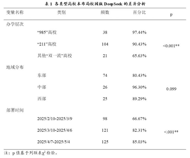 從創(chuàng)新擴(kuò)散的視角來(lái)看,DeepSeek在高校層級(jí)與地域?qū)用娴耐茝V過(guò)程呈現(xiàn)出典型由上而下的擴(kuò)散路徑,部署態(tài)勢(shì)表現(xiàn)出顯著的層級(jí)化差異。從辦學(xué)層次來(lái)看,DeepSeek部署比例隨著高校辦學(xué)層次遞減而逐級(jí)降低。如表1所示,截至2025年5月,全國(guó)“985”高校中已有38所部署DeepSeek,占比高達(dá)97.44%,“211”高校部署率為90.43%,而在非“211”高校但仍屬于“雙一流”建設(shè)高校中,僅有69.63%的高校完成部署,不同辦學(xué)層次的高校在是否部署DeepSeek上有顯著的統(tǒng)計(jì)學(xué)差異(p<0.001)。這一趨勢(shì)表明,辦學(xué)層次較高的高校更易獲得人工智能布局的政策與資源支持,部署節(jié)奏也更為迅速,展現(xiàn)出較強(qiáng)的先行示范效應(yīng)。國(guó)家重點(diǎn)建設(shè)的“985”與“211”高校,通常擁有更充裕的科研經(jīng)費(fèi)與更強(qiáng)的技術(shù)基礎(chǔ)設(shè)施,在校內(nèi)具備較為完善的信息化管理體系,更容易對(duì)接并落地通用大模型。相較之下,部分普通“雙一流”高校在硬件投入、技術(shù)團(tuán)隊(duì)建設(shè)和跨部門(mén)協(xié)同方面仍存在短板,使其在部署大模型時(shí)面臨更多的現(xiàn)實(shí)制約。從高校地域來(lái)看,部署率在不同區(qū)域間的總體差異并不顯著,但仍呈現(xiàn)出一定的地域分布規(guī)律。地域差異的成因既包括地區(qū)經(jīng)濟(jì)發(fā)展水平、教育信息化建設(shè)程度等客觀因素,也受到地方政策引導(dǎo)、教育行政管理方式與高校間協(xié)作機(jī)制的影響。中部地區(qū)有較強(qiáng)的區(qū)域協(xié)同傳統(tǒng)與高校聯(lián)盟體系,使得新技術(shù)推廣可以通過(guò)以點(diǎn)帶面的模式快速擴(kuò)展。相較之下,東部地區(qū)的部署節(jié)奏反而略顯滯后,可能與高校自主性較高有關(guān)。從部署時(shí)間來(lái)看,高校大規(guī)模部署DeepSeek的時(shí)間集中在二月中旬到四月上旬,呈現(xiàn)出迅速增長(zhǎng)到逐漸飽和的規(guī)律,“雙一流”高校對(duì)DeepSeek的部署時(shí)間上存在顯著的統(tǒng)計(jì)學(xué)差異(p<0.001)。