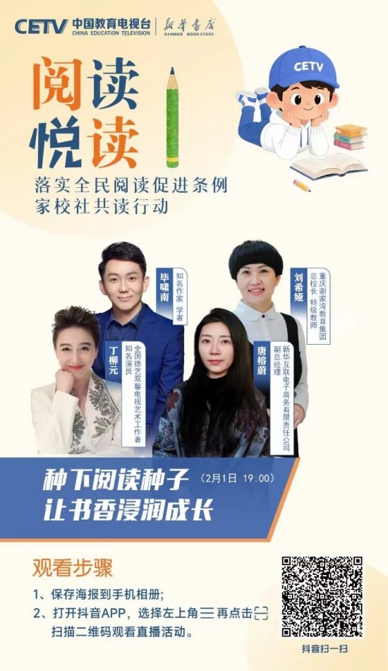 為推動條例有效落地、培養(yǎng)廣大青少年更好地閱讀,在教育部基礎(chǔ)教育司指導(dǎo)下,中國教育電視臺聯(lián)合人民教育出版社、新華書店總店,特邀閱讀推廣人、閱讀領(lǐng)誦人、閱讀分享人等,共同開啟“落實全民閱讀促進條例 家校社共讀行動”全媒體直播活動。這不僅是對條例精神的踐行,更是對“讀書破萬卷,下筆如有神”的文化傳承,是為青少年搭建與先賢對話、與自我對話、與世界對話的精神橋梁。