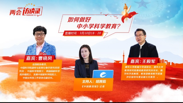 3月10日18:20,我們特邀請(qǐng)全國(guó)政協(xié)委員、中國(guó)科學(xué)院院士曹曉風(fēng)以及清華大學(xué)附屬中學(xué)原校長(zhǎng)、清華大學(xué)教育研究院基礎(chǔ)教育研究所所長(zhǎng)王殿軍,做客中國(guó)教育報(bào)刊社“兩會(huì)訪談錄”直播間,圍繞如何做好中小學(xué)科學(xué)教育展開(kāi)深入探討,敬請(qǐng)關(guān)注!