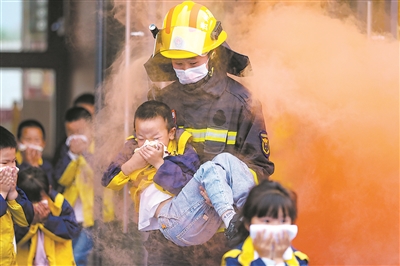 5月11日,消防員在貴州省銅仁市玉屏侗族自治縣皂角坪幼兒園引導(dǎo)小朋友進(jìn)行火災(zāi)逃生演練。5月12日是全國(guó)防災(zāi)減災(zāi)日。近日,該縣組織紅十字、消防、公安、應(yīng)急等部門(mén)的專業(yè)人員,深入各中小學(xué)、幼兒園開(kāi)展防災(zāi)減災(zāi)主題活動(dòng),提高教師和學(xué)生的防災(zāi)意識(shí)和應(yīng)急救護(hù)能力。胡攀學(xué) 攝