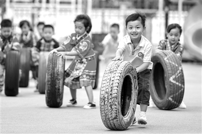 8月31日,浙江省湖州市長興縣畫溪街道包橋中心幼兒園的孩子們一起趣玩花樣滾輪胎。當(dāng)日,該園組織孩子們歡跳竹竿舞、趣味投壺等體育運(yùn)動,體驗(yàn)多種趣味運(yùn)動。譚云俸 攝