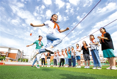 9月2日,江蘇省海安市城南實(shí)驗(yàn)小學(xué)的學(xué)生們?cè)诓賵?chǎng)上跳橡皮筋。新學(xué)期伊始,該校在校園內(nèi)積極開(kāi)展豐富多彩的文體、科技類(lèi)特色活動(dòng),豐富延時(shí)服務(wù)內(nèi)容,促進(jìn)孩子們健康快樂(lè)成長(zhǎng)。翟慧勇 攝