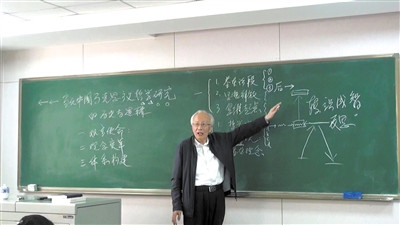 孫正聿給本科生講課常常伴著一支粉筆、一杯清茶,一站就是一個半小時。他講課的特點是以理服人、邏輯嚴(yán)謹(jǐn)、絲絲入扣?!熬拖裨谧x偵探小說一樣!”王慶豐說。