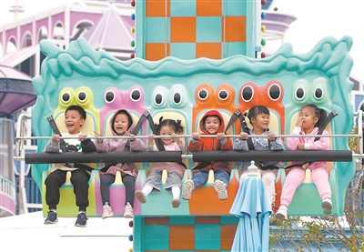 10月6日,在江西省南昌市西湖區(qū)歡樂星際樂園,孩子們體驗太空主題的游樂項目。國慶假期,人們用多種方式休閑放松,樂享假期。新華社記者 萬象 攝