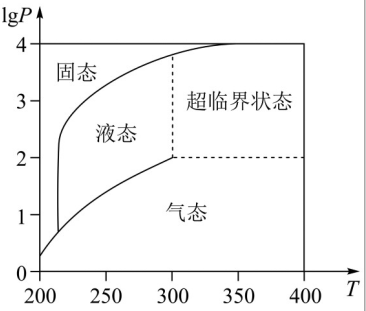 在北京冬奧會上,國家速滑館“冰絲帶”使用高效環(huán)保的二氧化碳跨臨界直冷制冰技術,為實現(xiàn)綠色冬奧作出了貢獻。如圖描述了一定條件下二氧化碳所處的狀態(tài)與T和lgP的關系,其中T表示溫度,單位是K;P表示壓強,單位是bar。下列結論中正確的是()