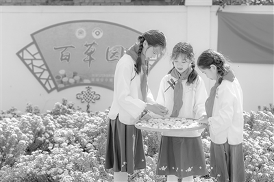 近日,江蘇省高郵市秦郵小學(xué)開展了以“菊花朵朵,茶香裊裊”為主題的勞動隊(duì)課。在學(xué)校特色中草藥實(shí)踐基地“百草園”里,學(xué)生們認(rèn)真采摘親手種植的菊花,清洗雜質(zhì)后放入竹篩,在勞動、體驗(yàn)、觀察中增強(qiáng)民族自信和文化認(rèn)同感。孫靜 攝 劉長軍 文