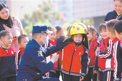 11月8日,在浙江省湖州市德清縣武康街道機(jī)關(guān)幼兒園,消防員指導(dǎo)小朋友試戴滅火救援頭盔。德清縣消防救援大隊(duì)聯(lián)合機(jī)關(guān)幼兒園開展“119”消防主題活動(dòng),小朋友通過體驗(yàn)滅火器的使用、參觀消防器材裝備、參與火災(zāi)疏散演練等方式,提升消防安全意識,增強(qiáng)自我保護(hù)能力。