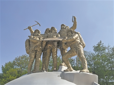 從遠處看,這尊名為《攀登》的雕塑高大雄偉,上半部分的攀登者雕像,由五名登山科考隊員組成,雕像中,有的高舉冰鎬,有的手持“登山隊”的隊旗。每個雕像看上去神采奕奕,他們注目遠方,眼神里充滿自信。而雕塑的下半部分,是一個具有現(xiàn)代風格的不銹鋼地球穹頂造型。穹頂?shù)膬炔?,則是聲光電的裝置,若是晚上來參觀,整個雕塑顯得“光彩照人”。