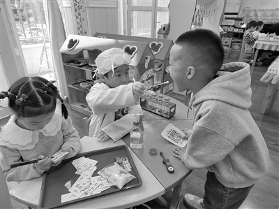 活動(dòng)過程:教師和孩子們共同討論“為什么我們班今天做核酸很慢”的問題。有的孩子說:“卡片太小,很容易丟?!庇械暮⒆诱f:“因?yàn)槔蠋熞粋€(gè)一個(gè)地發(fā)放,就很慢。”對此,我們想出了改進(jìn)措施。第一,教師將健康碼重新打印出來,調(diào)整好大小并進(jìn)行塑封。當(dāng)我們將健康碼再次發(fā)給孩子們的時(shí)候,有的孩子說:“老師,我覺得這個(gè)靜態(tài)碼不好看?!痹趺崔k呢?有的孩子提議:“我們可以在空白的地方畫一些小裝飾呀!”這樣的想法得到了很多孩子的支持,于是每個(gè)人都給自己的靜態(tài)碼畫上了喜歡的邊框,每個(gè)人的靜態(tài)碼都變得獨(dú)一無二了。第二,靜態(tài)碼如何管理呢?我們利用一個(gè)小口袋,每個(gè)人在小口袋上做了自己的標(biāo)記,然后將靜態(tài)碼放進(jìn)小口袋,當(dāng)需要做核酸的時(shí)候,可以自己去取健康碼。第三,健康碼不僅能用于日常做核酸,在一次區(qū)域游戲時(shí),我驚喜地發(fā)現(xiàn)孩子們將健康碼用在了游戲中,嘗試在“小醫(yī)院”開展做核酸的游戲,每個(gè)來到“小醫(yī)院”的孩子,都會(huì)自主取下健康碼,“小醫(yī)生”掃碼、做核酸,游戲變得更加真實(shí)有趣。
