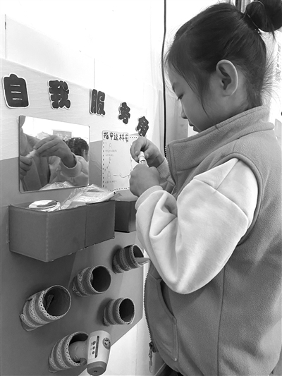 活動過程:自我服務(wù)角完全由幼兒自主管理,主要涵蓋三方面內(nèi)容。一是幼兒在需要其他材料或者遇到自己解決不了的問題時,可以向家長、教師尋求幫助。在與幼兒共同商議后,我們增設(shè)了指甲刀、棉簽、口罩、鏡子、抽紙等物品,并將它們擺在便于幼兒取放的位置。二是幼兒自主選擇所需物品進行自我服務(wù),如幼兒洗手后自己涂抹護手霜。三是幼兒在用完所需物品后,按照標志或位置將其歸納整理好。