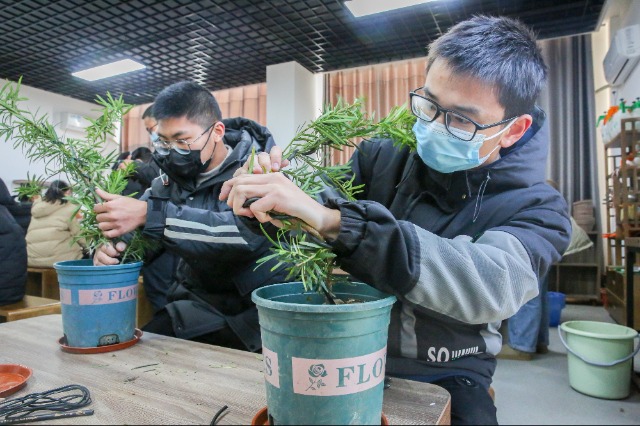 近日,在江蘇省如皋市第二中學(xué),學(xué)生在學(xué)習(xí)非遺如皋盆景制作技藝。自“雙減”政策實(shí)施以來,該校聯(lián)合如皋市文化館共同建設(shè)“非遺課程基地”,豐富學(xué)生校園生活,促進(jìn)學(xué)生健康成長(zhǎng)。徐慧 攝