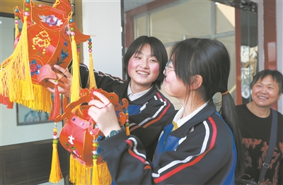 1月3日,正在對學(xué)生宮燈作品進行點評的刺繡藝術(shù)師、甘肅省張掖市非遺保護項目王氏宮燈掛件制作技藝傳承人王秀娥(右一)和學(xué)生在一起。張掖市民樂縣職業(yè)教育中心學(xué)校組織非遺傳承人通過學(xué)校社團、課外興趣小組等,針對不同學(xué)齡段的學(xué)生開展常態(tài)化授課,傳承非遺保護項目,弘揚中華優(yōu)秀傳統(tǒng)文化。本報記者 張學(xué)軍 攝