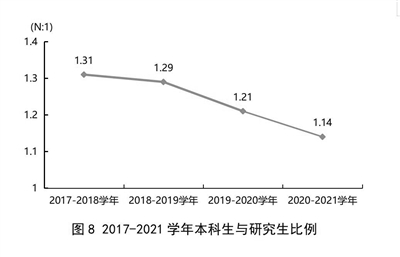 從招生結(jié)構(gòu)上來看,數(shù)據(jù)顯示,從2017—2018學(xué)年至今,一流大學(xué)建設(shè)高校校均本科生與研究生比例持續(xù)下降,2020—2021學(xué)年,校均本科生與研究生比例已經(jīng)接近1:1。