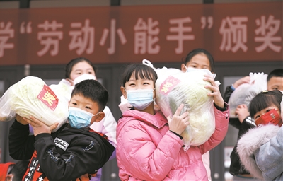 1月11日,山東省臨沂市沂南縣蘇村鎮(zhèn)中心小學對評選出的30名“勞動小能手”進行表彰,每人獎勵一個蔬菜大禮包:兩棵白菜和兩個水果蘿卜。近年來,蘇村鎮(zhèn)中心小學積極開展勞動教育,設(shè)立“校園農(nóng)場”,學生在教師指導(dǎo)下學習種植蔬菜和糧食,收獲的農(nóng)產(chǎn)品除了供應(yīng)學校食堂外,還拿出一部分獎勵“勞動小能手”,讓學生們感受勞動的光榮和快樂。杜昱葆 攝