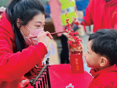 伴隨著春天的腳步,上海市寶山區(qū)淞南鎮(zhèn)星星幼兒園迎來(lái)了新學(xué)期。該園教師設(shè)計(jì)了豐富多彩的活動(dòng),營(yíng)造輕松愉快的開(kāi)學(xué)氛圍。圖為教師為幼兒“點(diǎn)朱砂”,祝福他們聰慧睿智、健康成長(zhǎng)。季素琴 攝