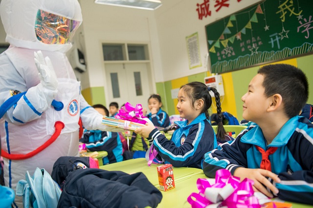 近日,新疆維吾爾自治區(qū)烏魯木齊市第五十九小學(xué)會展校區(qū)教師變身“航天員”為學(xué)生們發(fā)新書。該校通過組織科技探索、趣味游戲等活動,讓學(xué)生們享受校園快樂時光。孫振嵩 攝