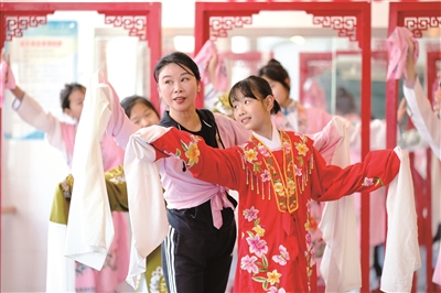 3月15日,在浙江省湖州市德清縣洛舍鎮(zhèn)中心學(xué)校,戲曲特色班的學(xué)生在教師的指導(dǎo)下學(xué)習(xí)戲曲基礎(chǔ)知識(shí)和戲曲表演技巧。