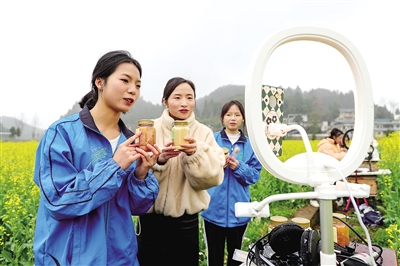 3月18日,貴州省黔東南苗族侗族自治州岑鞏縣中等職業(yè)技術學校電子商務專業(yè)的學生在油菜花地里學習直播銷售蜂蜜。近年來,該校將實操課程搬進田間地頭等生產一線,培養(yǎng)“訂單式”職業(yè)人才,拓寬畢業(yè)生就業(yè)渠道。新華社發(fā)