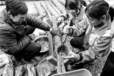 近日,在四川省巴中市通江縣諾水河鎮(zhèn)臨江村通江段木銀耳非遺體驗(yàn)基地,諾水河鎮(zhèn)中心小學(xué)學(xué)生在非遺傳承人指導(dǎo)下學(xué)習(xí)段木銀耳栽植技藝。程聰 攝