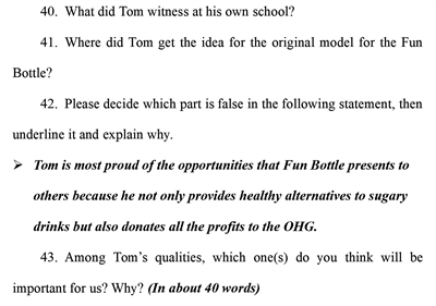 該閱讀短文是一篇記敘文,講述的是15歲的發(fā)明家和創(chuàng)業(yè)者湯姆發(fā)明了一種名為Fun Bottle的杯子,為人們提供了更加健康和便攜的果蔬飲品,并將部分售賣所得用作慈善的故事。題目要求考生閱讀這篇短文后,用英文回答問題。不同于客觀選擇題,該題型需要學生在準確理解和把握語篇意義的基礎上,形成語句精準表達,從多角度、多層面考查考生通過閱讀獲取有效信息、合理處理信息并將其轉(zhuǎn)化為書面表達的能力。