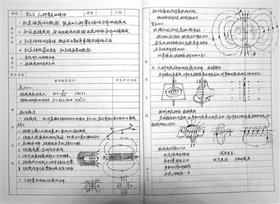 隨手翻開(kāi)手寫教案上“電阻、電感、電容對(duì)交流電的影響”這一章節(jié),知識(shí)點(diǎn)分類有序、簡(jiǎn)潔明了,配有詳細(xì)圖示和心得體會(huì)。記者特意找到往年同題教案,仔細(xì)觀察發(fā)現(xiàn),兩本教案上的內(nèi)容并不一樣。