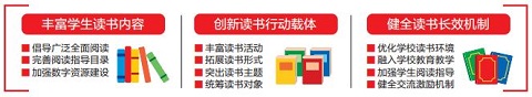 《實施方案》要求,豐富學生讀書內容,根據青少年學生認知規(guī)律和身心發(fā)展特點,引導青少年學生珍惜大好年華,倡導廣泛全面閱讀;結合中小學課程標準要求,做好內容審核把關,確保青少年學生讀物質量,完善閱讀指導目錄;充分發(fā)揮數字化支撐作用,開設國家智慧教育讀書平臺,有效利用“學習強國”、中國語言文字數字博物館及各地各校數字平臺,加強數字資源建設。在創(chuàng)新讀書行動載體方面,要豐富讀書活動,各地各校要因地因校制宜,著力打造富有吸引力、影響力的青少年學生讀書品牌項目,學校要組建學生讀書社團或興趣小組;拓展讀書形式,實施師生共讀行動,名家領讀行動、家庭親子閱讀行動;突出讀書主題,實施“學習新思想 做好接班人”主題讀書行動、“學科學 愛科學”主題讀書行動、“典耀中華”主題讀書行動;統(tǒng)籌讀書對象,面向職業(yè)院校學生實施“未來工匠”讀書行動,面向普通高校學生實施“書香激揚青春”讀書行動,面向農村中小學生實施“我的書屋·我的夢”讀書行動。