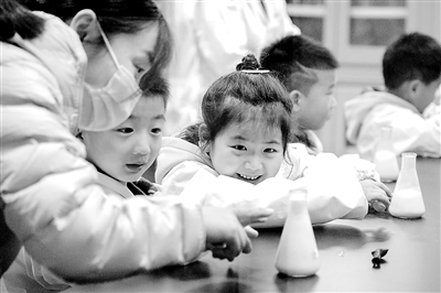 3月30日,在浙江省湖州市長興縣食品藥品檢驗(yàn)檢測中心,長興縣機(jī)關(guān)幼兒園的孩子們觀察酵母菌呼吸實(shí)驗(yàn)。當(dāng)日,該園組織孩子們走進(jìn)實(shí)驗(yàn)室,通過學(xué)習(xí)食品安全檢測相關(guān)流程、參與趣味小實(shí)驗(yàn),探究科學(xué)原理,豐富課外知識。