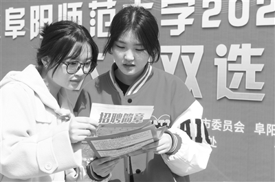 近日,求職大學生在雙選招聘會現(xiàn)場了解招聘信息。日前,安徽省阜陽市“暖民心·促就業(yè)”招才引智校園行暨阜陽師范大學2023屆畢業(yè)生大型雙選會在阜陽師范大學體育中心南廣場舉辦。王彪 攝