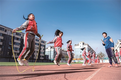 ④3月28日,內(nèi)蒙古自治區(qū)呼和浩特市玉泉區(qū)通順街小學學生在春光明媚的校園里進行跳繩項目測試。丁根厚 攝