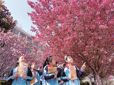 近日,山東省青州市旗城小學(xué)校園里春光明媚,玉蘭花開,櫻花爭艷。學(xué)生們利用大課間三三兩兩自發(fā)來到花樹下,或閱讀,或賞花,或徜徉,盡享美麗春光。
