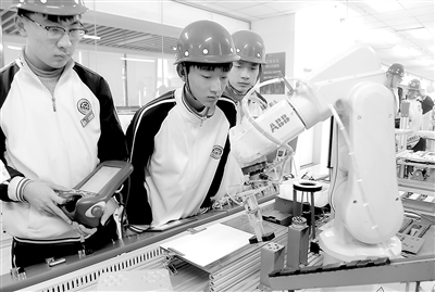 上圖:工業(yè)機(jī)器人技術(shù)應(yīng)用專業(yè)學(xué)生正在操作機(jī)器人手臂進(jìn)行物料搬運(yùn)和碼垛工作。這項(xiàng)技能實(shí)操是全國職業(yè)院校技能大賽中職組“機(jī)器人技術(shù)應(yīng)用賽項(xiàng)”的核心內(nèi)容,該校學(xué)生曾獲此項(xiàng)“國賽”兩金一銀。本報(bào)記者 孫軍 攝