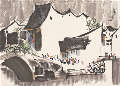 吳冠中水墨畫(huà)《雙燕》中,雙飛的燕子低掠過(guò)黑色線條畫(huà)就的屋檐,屋檐下白墻垂掛下來(lái),倒映在明鏡般的水面上?!峨p燕》的主體是江南水鄉(xiāng)黑白世界的想象,黑色的門(mén)窗、黑色的飛檐,點(diǎn)綴在大片的白墻上,寧?kù)o的空間和飛動(dòng)的燕子,組成了吳冠中魂?duì)繅?mèng)繞的故鄉(xiāng)場(chǎng)景。《雙燕》完成于1981年的一次江南偶遇,在此前一年完成的素描寫(xiě)生《寧波水鄉(xiāng)》(1980)中,與《雙燕》中類似的建筑圖案占據(jù)了整幅繪畫(huà)的一半,另一半則是勾滿了水波紋的村鎮(zhèn)水道,倒映在水中的垂柳也變成無(wú)數(shù)彎曲的線,猶如夢(mèng)幻中飛旋的印象。如果說(shuō)白居易的“日出江花紅勝火,春來(lái)江水綠如藍(lán)”為我們留下了古典江南色彩旖旎的想象形式的話,那么吳冠中的江南黑白則以素雅之美重構(gòu)了我們今天對(duì)江南的記憶。江南在吳冠中心中是對(duì)故鄉(xiāng)的依戀;對(duì)普通人而言,江南是平鋪的黑白,是宣紙上的墨色點(diǎn)染,是無(wú)限的美好在心中升騰飛旋。