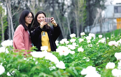 日前,江蘇大學學生在牡丹園內賞花。江蘇省鎮(zhèn)江市江蘇大學牡丹園內的洛陽紅、花王、霓虹幻彩等41個品種的兩千余株牡丹陸續(xù)綻放,吸引不少師生前往觀賞。