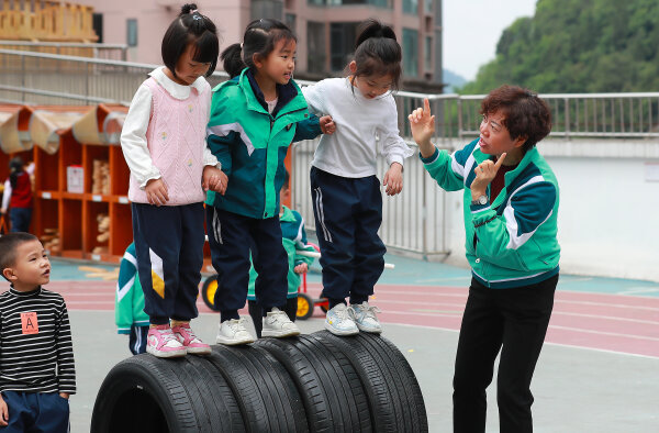 近日,貴州省仁懷市國酒城第一幼兒園教師丁冰鼓勵孩子們參與“好玩的輪胎”游戲,鍛煉孩子們的膽量,培養(yǎng)團結(jié)合作精神。近年來,貴州省仁懷市積極推動城鎮(zhèn)小區(qū)配套幼兒園建設(shè),保證居住區(qū)配套幼兒園規(guī)模、數(shù)量與城市發(fā)展和人口增長相適應(yīng)。