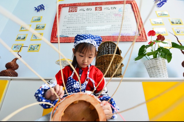 近日,在山東省臨沂市臨沭縣第五實驗小學(xué)開展的“學(xué)柳藝 傳非遺”主題教育活動上,一名學(xué)生在編制柳筐。近期,該校開展“學(xué)柳藝 傳非遺”主題教育活動,孩子們在教師的指導(dǎo)下,學(xué)習(xí)掌握柳編技巧,傳承弘揚中華優(yōu)秀傳統(tǒng)文化。王海濱 攝