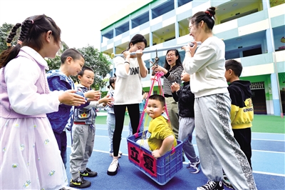 5月5日,湖北省襄陽(yáng)市??悼h縣直機(jī)關(guān)幼兒園教師用傳統(tǒng)方法給孩子稱體重。立夏將至,該幼兒園開(kāi)展繪彩蛋、稱體重等活動(dòng),讓孩子們感受立夏傳統(tǒng)民俗。楊韜 黃丹 攝