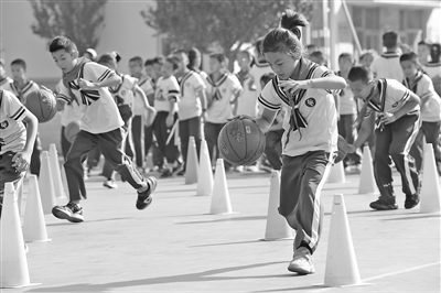 在牟平區(qū)第二實(shí)驗(yàn)小學(xué),考慮到場(chǎng)地不足、學(xué)生年齡和體質(zhì)差異等因素,學(xué)校錯(cuò)時(shí)、分層開展“五彩大課間”體育鍛煉活動(dòng),除了500米跑步熱身之外,該校還穿插安排了花樣跳繩、動(dòng)感籃球等體育活動(dòng),確保體育課剛性落實(shí)?!拔迥昙?jí)的學(xué)生曲英豪球感特別好,擔(dān)任動(dòng)感籃球大課間小組長(zhǎng),當(dāng)起了‘小老師’,以前一說(shuō)話就臉紅的他,現(xiàn)在變得開朗、活潑、自信了?!备毙iL(zhǎng)孔令環(huán)說(shuō)。