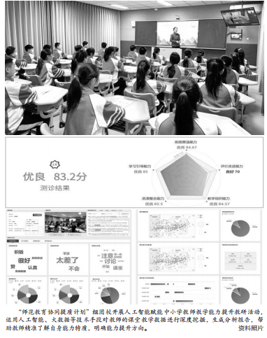 這種指向教師能力發(fā)展AI測診的環(huán)境,集傳統(tǒng)課室、視頻錄播、數(shù)據(jù)采集、數(shù)據(jù)呈現(xiàn)等功能于一體,實現(xiàn)AI課堂分析數(shù)據(jù)實時呈現(xiàn),可以生成教師課堂教學(xué)能力AI測診報告,輔助專家教師指導(dǎo)、名師名校長聽評課、學(xué)校教研備課、師范生實踐教學(xué)改進(jìn)等需要,推動了教師反思和教育教學(xué)行為的規(guī)范提升。目前,在“師范教育協(xié)同提質(zhì)計劃”中,已建成10個這樣的標(biāo)準(zhǔn)化“智慧教室”。