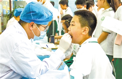 近日,醫(yī)生在為學(xué)生做牙齒檢查。北京市通州區(qū)南關(guān)小學(xué)組織全體學(xué)生進(jìn)行每年一次的例行身體檢查,包括眼科、內(nèi)科等9大項(xiàng)25小項(xiàng)常規(guī)檢查,及時(shí)了解學(xué)生身體生長(zhǎng)情況,科學(xué)管理學(xué)校衛(wèi)生保健工作。宋利成 攝