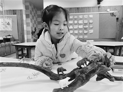 天佑說要帶著小動(dòng)物去玩,她先設(shè)計(jì)好路線,試著把小動(dòng)物都放到樹枝上。她一邊放一邊說:“好難呀,這個(gè)需要保持平衡?!闭麄€(gè)過程天佑十分專注,用了整整6分鐘才把所有小動(dòng)物都放上去。放完后,天佑在旁邊畫上了自己、鮮花和樹木,一邊畫,一邊講述著自己帶小動(dòng)物去玩的故事。