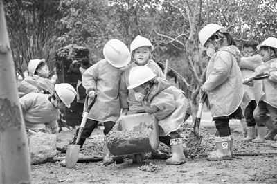 幼兒園的“曹娥江水利場”就是從無到有的典型案例之一。曹娥江是上虞的母親河,始于2003年的“一江兩岸”景觀工程,是最能展示上虞形象、最具上虞辨識度的地標性景觀,也是幼兒和家長經(jīng)常去游玩的休閑場所。有一天,大班幼兒提出:“我們在幼兒園也來挖一條曹娥江吧!”這得到了老師們的支持和鼓勵。面對曹娥江“挖在哪里、挖多長、誰來挖、怎么挖”等一系列問題,幼兒進行了設(shè)計、規(guī)劃、選址、招募工程隊等籌備活動。挖江工程開始后,各工程隊分段挖掘,嘗試用鐵鍬、鋤頭等各種工具挖土,在有石頭和樹根的地段,還借助了挖掘機。